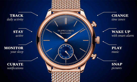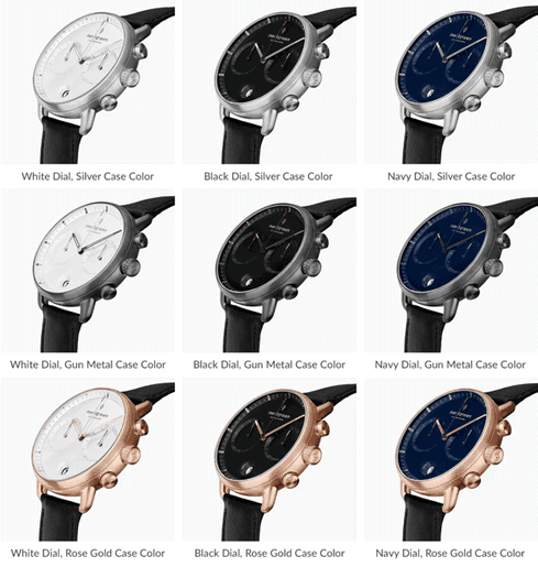 تأتي الساعة بثلاثة ألوان للاتصال - الأزرق والأسود والأبيض - وثلاثة ألوان للهيكل - معدن مسدس وفضي وذهبي وردي.