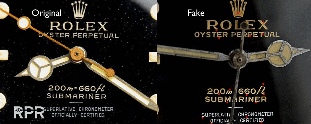 Das Detail auf dem Zifferblatt, einschließlich der Größe des Logos, der Typografie und des Wortlauts auf dem Zifferblatt einer Fälschung, ist oft nicht perfekt, obwohl Fälscher dies besser machen - in dem Maße, wie einige Experten getäuscht wurden. Diese detaillierten Elemente einer Uhr sind sehr schwer originalgetreu zu reproduzieren und können darauf hinweisen, dass es sich um eine Fälschung handelt.