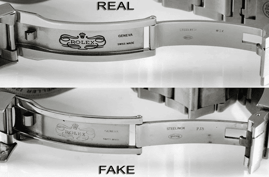 Bei Fälschungen führt dies häufig zu schlecht sitzenden Armbandendgliedern, bei denen sie mit den Gehäuselaschen in Verbindung stehen, sowie zu Metallgehäusen und Armbändern mit rauen Kanten und Oberflächen. Armbänder an einer echten Uhr haben häufig Stempel im Faltverschlussmechanismus. Ein weiteres Werbegeschenk sind Lünetten, die sich nicht reibungslos oder gar nicht drehen lassen - alles gemeinsame Merkmale einer gefälschten Uhr.